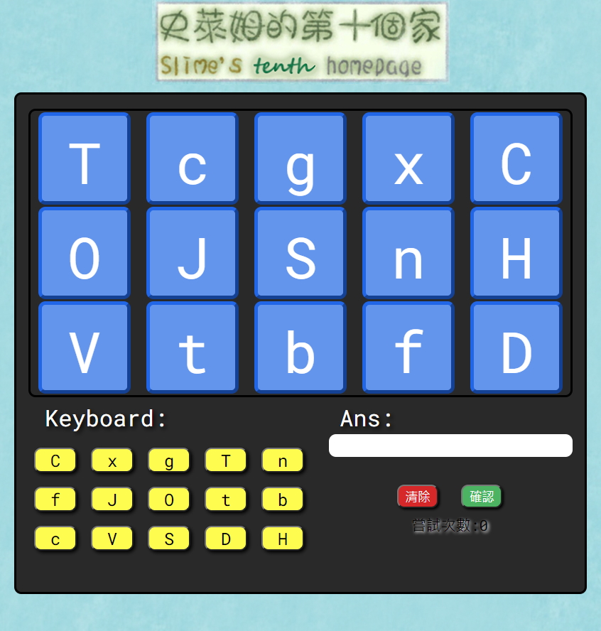 用 jQuery 打造的翻牌遊戲,先記下版面所顯示的數字順序,再依序選擇對應的英文字母,有兩種模式 : 全大寫( 較簡單 )與大小寫混雜( 較困難 )。