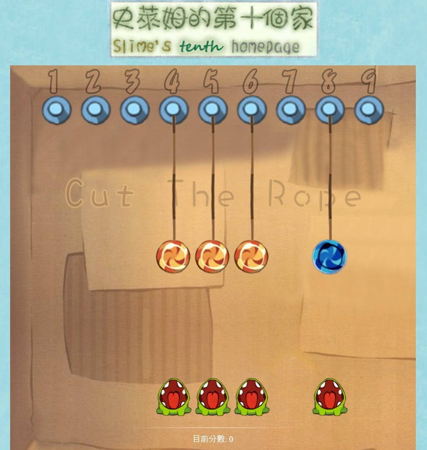 用 JavaScript 打造的小遊戲,在15秒內盡可能地切斷繩子讓小怪物吃到糖果,避免切到有毒的糖果,支援鍵盤數字操作。